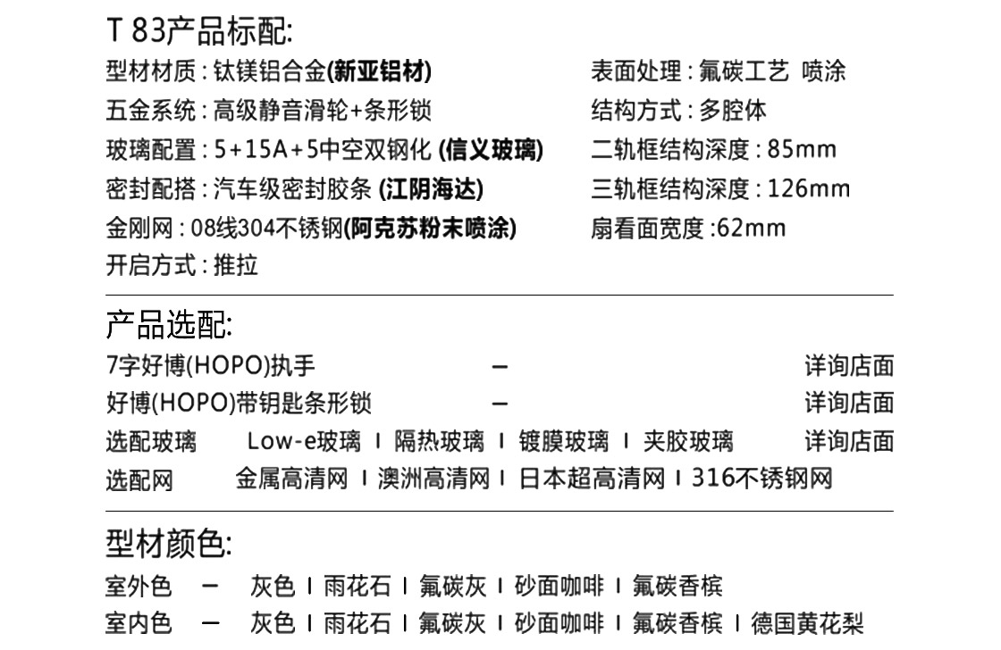 標配: 0.7絲304金剛網;選配0.6-0.8絲304金剛網,可做擋水軌,低軌,走銅條;標配五金配件:保羅漢紗條形鎖、重型不銹鋼尼龍輪、不銹鋼防擺輪;選配: D形拉手、雙勾鎖體、可做豪華緩沖門 |